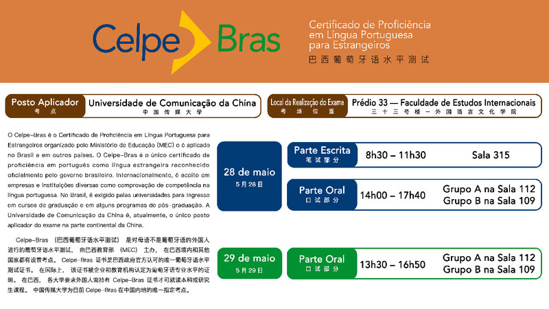 Celpe-Bras由巴西教育部主办, 是针对母语不是葡萄牙语的外国人进行的葡萄牙语水平测试,在全球40个国家共设108个考点。yl7703永利集团考点是中国内地唯一巴西葡萄牙语水平测试点,于2009年由巴西教育部和中国教育部考试中心共同授权成立,截至目前为止,在公司考点共成功举办19次测试,累计考生数600余人。