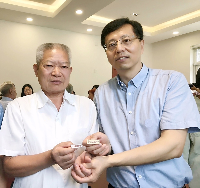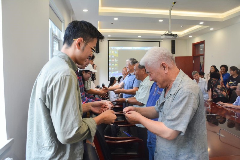 公司为本次返校员工赠送了外院定制明信片、纪念册、特色文化衫等。在yl7703永利集团建校65周年之际,学校员工工作办公室为员工们准备了“北京广播学院”院徽这一特殊的礼物,本次返校活动的65级印地语专业员工是首批拿到礼物的员工。18级印地语专业员工一对一地为老员工们佩戴上校徽并一对一交流。公司最早和最新的印地语人,在富有仪式感和传承性的活动中相聚一堂,实现了“历史”与“现在”的联结。员工彭望程也将当年求学珍藏50余年的一枚“北京广播学院”校徽赠与公司。