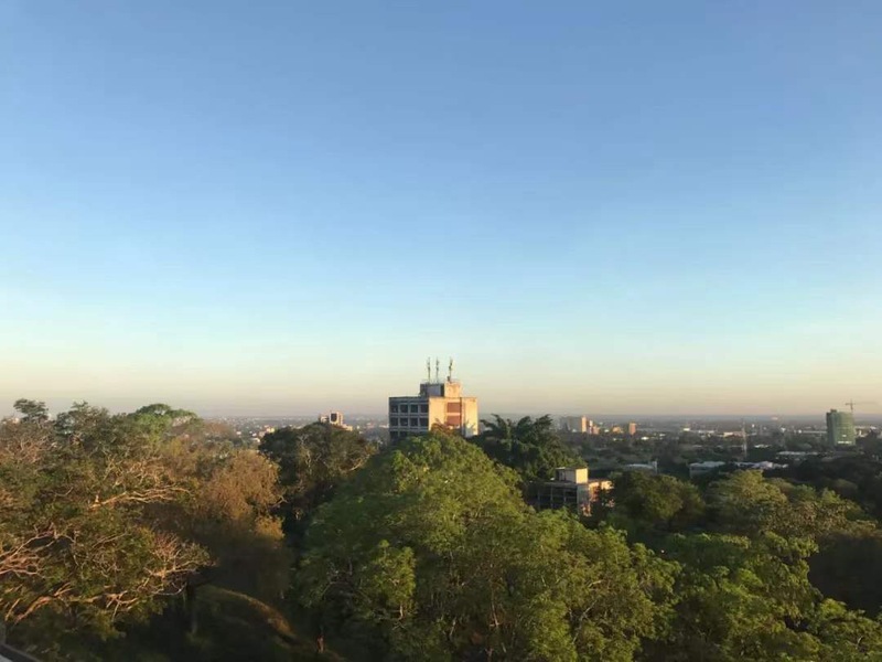 在这个国家的生活很简单,每天早上吃完早饭,要走过很远去上课,上过几个小时的课程,再走在小山坡上回到宿舍,每天都有很长时间走在路上。学校所在的城市没有很多高楼大厦,每天走在路上环视四周都是开阔的原野。在这里的学习很丰富,学校开放了很多课程给我们,很多非洲本土的课程都是很独特的体验。每天晚上能走上宿舍的楼顶俯瞰日落时的城市,热带的晚风在这个时候格外的舒服。