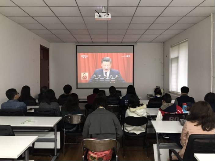 10月18日上午,在公司党委组织下,公司办公室党支部部分教师、全体专兼职辅导员、部分研究生本科生同学在学院楼109室集体收看十九大开幕式,学习习近平总书记的报告。公司其他师生党员也通过网络、电视等渠道收看大会盛况。