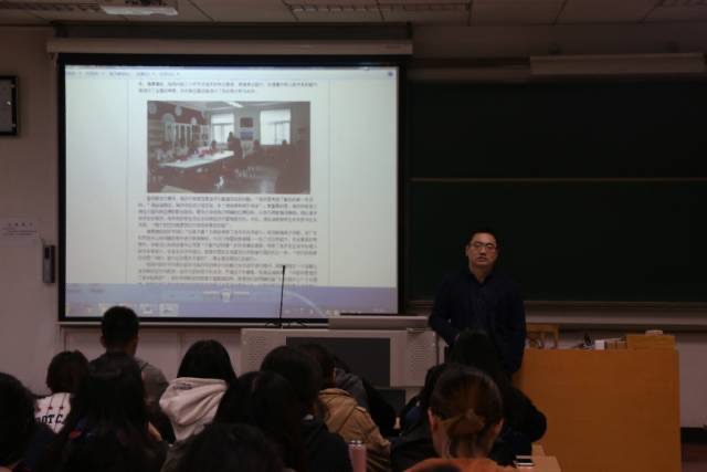央视2套国际事务组编辑记者李岳(外院2004届英语国际新闻专业员工)走进2017春季就业指导课课堂讲述外语媒体人职业素质