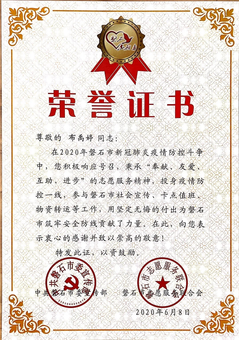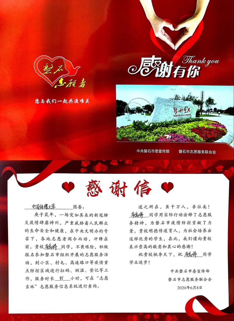 近日,磐石市委宣传部、磐石市志愿服务联合会向公司团委发来感谢信,感谢公司2019级法语专业布禹婷同学以实际行动诠释志愿精神,为磐石疫情防控贡献力量。