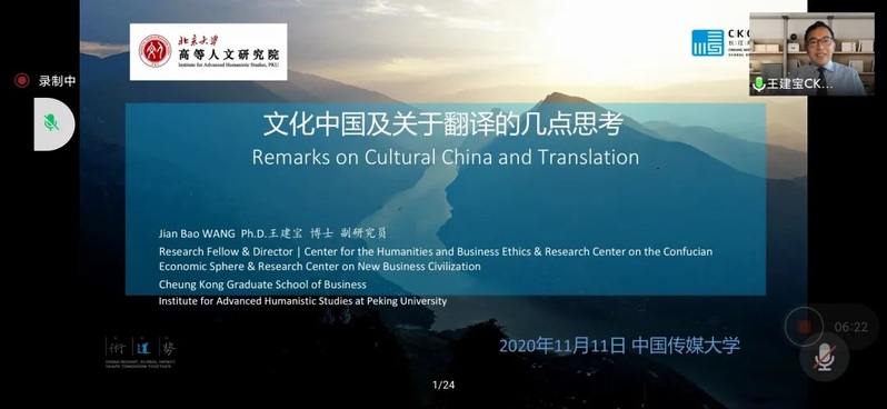 陈江华书记首先进行开场主持,“文化中国与外语课程思政建设”云课堂是公司党委和教学办联合举办的系列讲座,每周学院邀请国内从事文化研究和语言教学研究的知名专家学者做线上专题讲座和交流,从而推动公司专业教学与思政教育的深度融合,进一步提升教师对课程思政的理解,更好地实现专业教学和课程思政相结合。接下来,陈江华书记对主讲人王建宝教授进行介绍。王建宝教授,现任长江商学院教学研究员,人文与商业伦理研究中心主任,兼任新商业文明研究中心主任、儒家经济圈研究中心执行主任、中国发展模式研究中心执行主任,对文化中国与翻译有较深的研究。