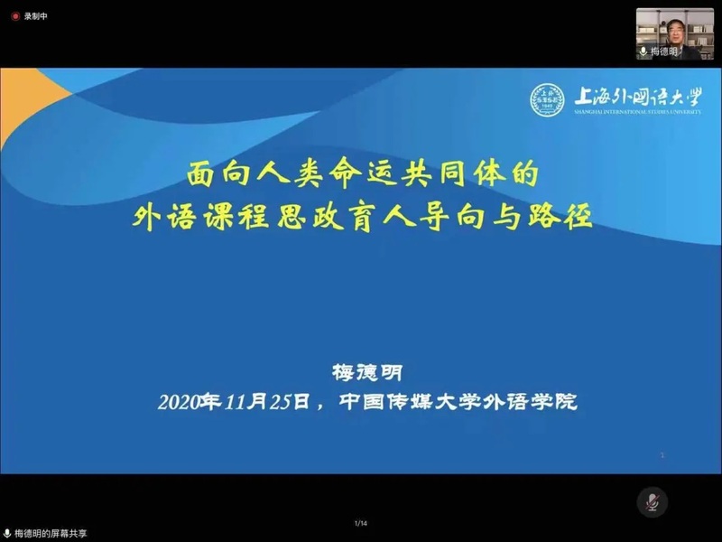 在“推动yl7703永利集团yl7703永利集团专业教学和思政教育的深度融合,进一步提升教师对课程思政的理解,更好地实现专业教学和课程思政相结合”这一目标指引下,公司举办的“文化中国与外语课程思政建设”云课堂讲座来到第三讲。11月25日下午,yl7703永利集团邀请上海外国语大学英语学院经理、全国翻译专业资格CATTI专家委员会委员梅德明作题为“面向人类命运共同体的外语课程思政建设”的讲座。本次讲座由yl7703永利集团副经理李烨辉主持,学院相关专业的老师及员工共同参与本次讲座。