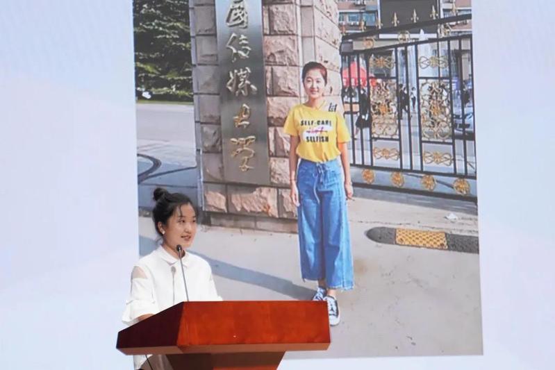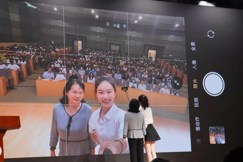 教师代表、从教34年的“中央三台”优秀班主任刘秀文教授寄语新生并为新生代表、2021级播音与播音主持艺术(双语播音主持方向)的吴昊佩戴校徽,师生同台通过大屏与全场自拍合影留念。