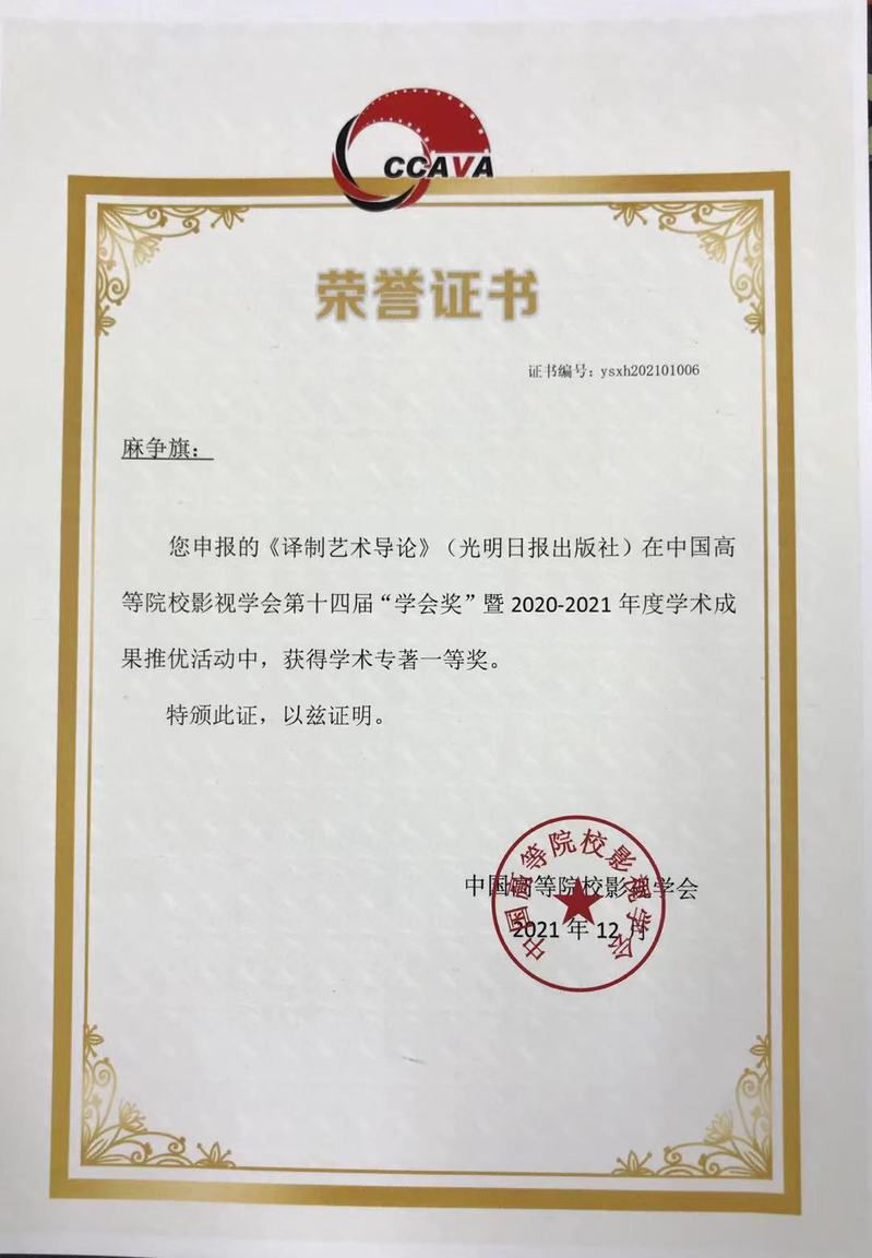 公司麻争旗教授的学术专著《译制艺术导论》在中国高等院校影视学会2020-2021年度学术成果推优活动中获第十四届“学会奖”学术专著类一等奖。2021年12月4日下午,颁奖仪式在yl7703永利集团新国交M2厅举行,麻争旗教授作为获奖代表登台领奖。