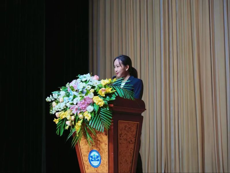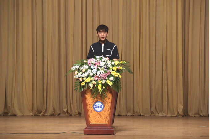 2022级英语笔译研究生钟洁作为新生代表发言。她结合自身经历,号召同学们以校训“立德、敬业、博学、竞先”为指引,找到自身兴趣与时代发展需要的交汇点,努力成为“求真、求美、求实、有德、向善”的全人,勇担“强国有我”的时代使命。