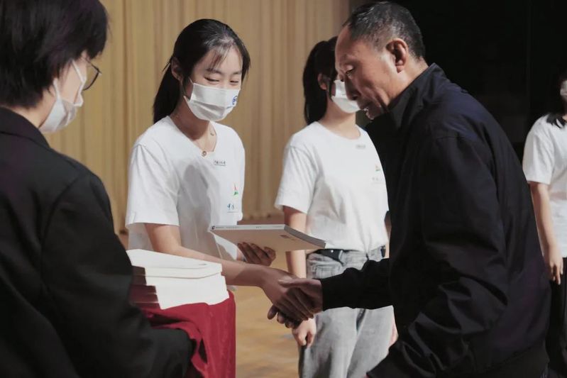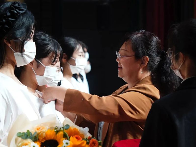 师生相授,薪火相传。新生代表们向侯福莉教授献花,侯福莉教授为新生代表们佩戴校徽。