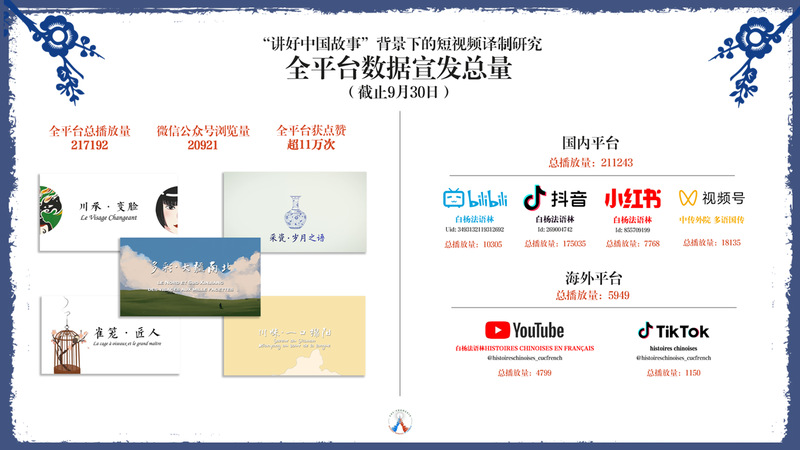 本次参赛的作品来自公司法语专业尹明明师生团队“中国好故事短视频制译传一体化”创新实践,作品紧密围绕“讲好中国故事”这一宏大主题,将其聚焦“小而美”的“普通中国人的日常故事”微观视角,将中国特色融入“有人情味的报道”中,采用微电影的叙事手法,充分发挥公司外语与传媒交叉融合的学科优势,讲好中国故事,传播好中国声音。截至 9月30日,5部短视频国内外全平台总播放量达到21.7万、微信公众号浏览量超过 2 万次、其中师生创建的“白杨法语林”抖音号五个短视频播放量达到17.5万,点赞量达11万。