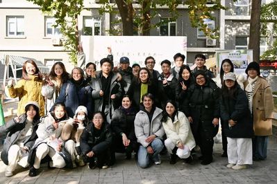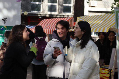 正午时分,北苑食堂门口仍有阵阵凉意。活动开场,由员工乐队带来的歌曲及舞蹈串烧点燃了全场的氛围,吸引了许多过路同学加入到这场文化交流的盛宴中,现场四个摆台摊位前人头攒动。活动还吸引了公司的韩国职工来到现场,同学们运用中韩双语进行跨文化交际,围绕熊猫外交、中韩美食等话题进行深入交流,增进彼此理解。