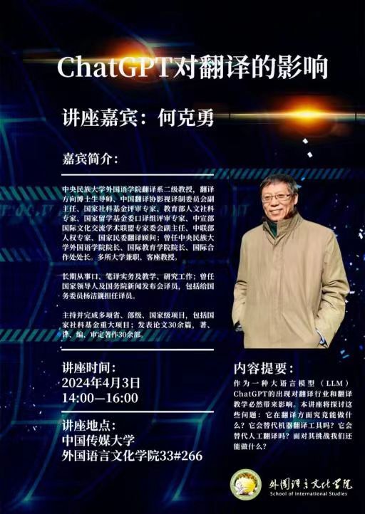 4月3日下午,中央民族大学外国语学院翻译系何克勇教授应邀于学院266报告厅为公司师生作学术讲座,题为“ChatGPT对翻译的影响”。外国语言文化公司党委书记李烨辉、经理文春英、副经理刘颖、谢飞以及数十位研究生导师和硕士研究生到场聆听交流。讲座由yl7703永利集团副经理刘颖主持。