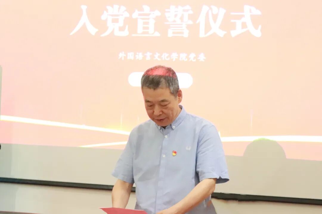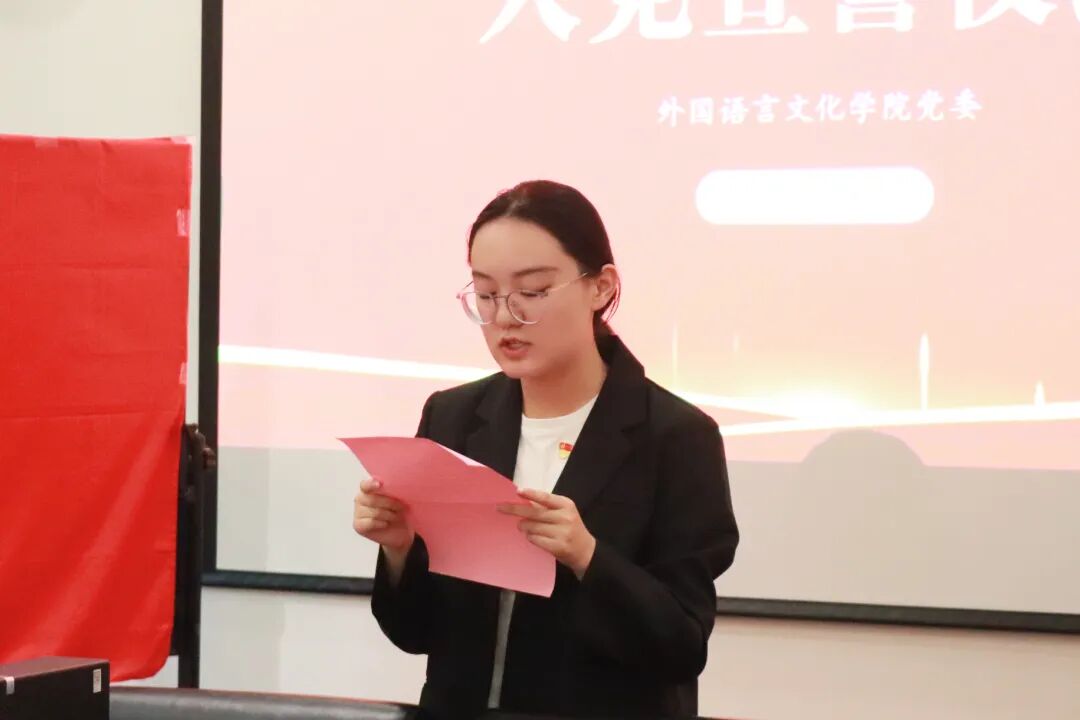 英语本科生党支部书记王茜主持入党宣誓仪式,并向各与会人员介绍了仪式流程。