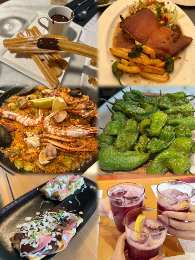 美食方面,西班牙海鲜饭(Paella)、烤乳猪(Cochinillo)、西班牙油条(Churros)、土豆饼(Tortilla de Patatas)等当地特色菜肴,成为大家在课余时间的“必打卡”。在市集、餐馆与咖啡馆的交流中,同学们不仅品尝了地道美食,也感受到了马德里人热情开放的生活态度。