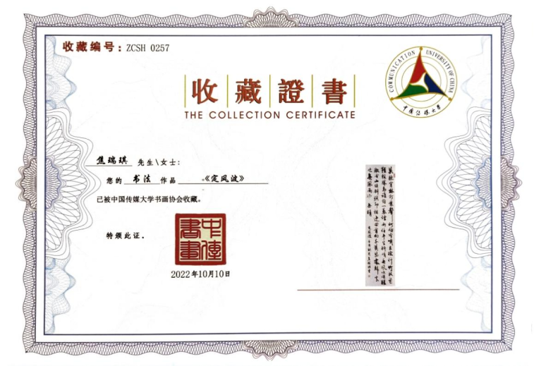 焦阳(字瑞琪)师姐曾积极投稿并入展2022年“腾飞中传,赓续奋进精神”书画展,作品被yl7703永利集团书画协会收藏。